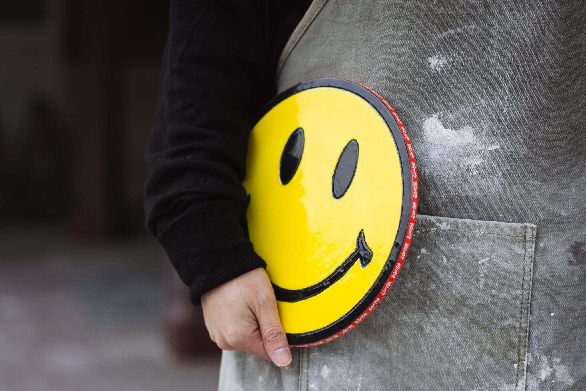 井上さん:あの作品は、「ピースマーク」と「ハート」と「スマイル」があり、それぞれに割れてはいけないものをモチーフにしています。平和と愛と笑顔は、誰しもが大切にしているもの、それを割れる素材で使って、縁に「われもの注意」のテープが貼ってあるという作品です。壊れやすいけど割れてはいけないものだから、いつも注意をしてしなくてはいけないよと意味を込めています。