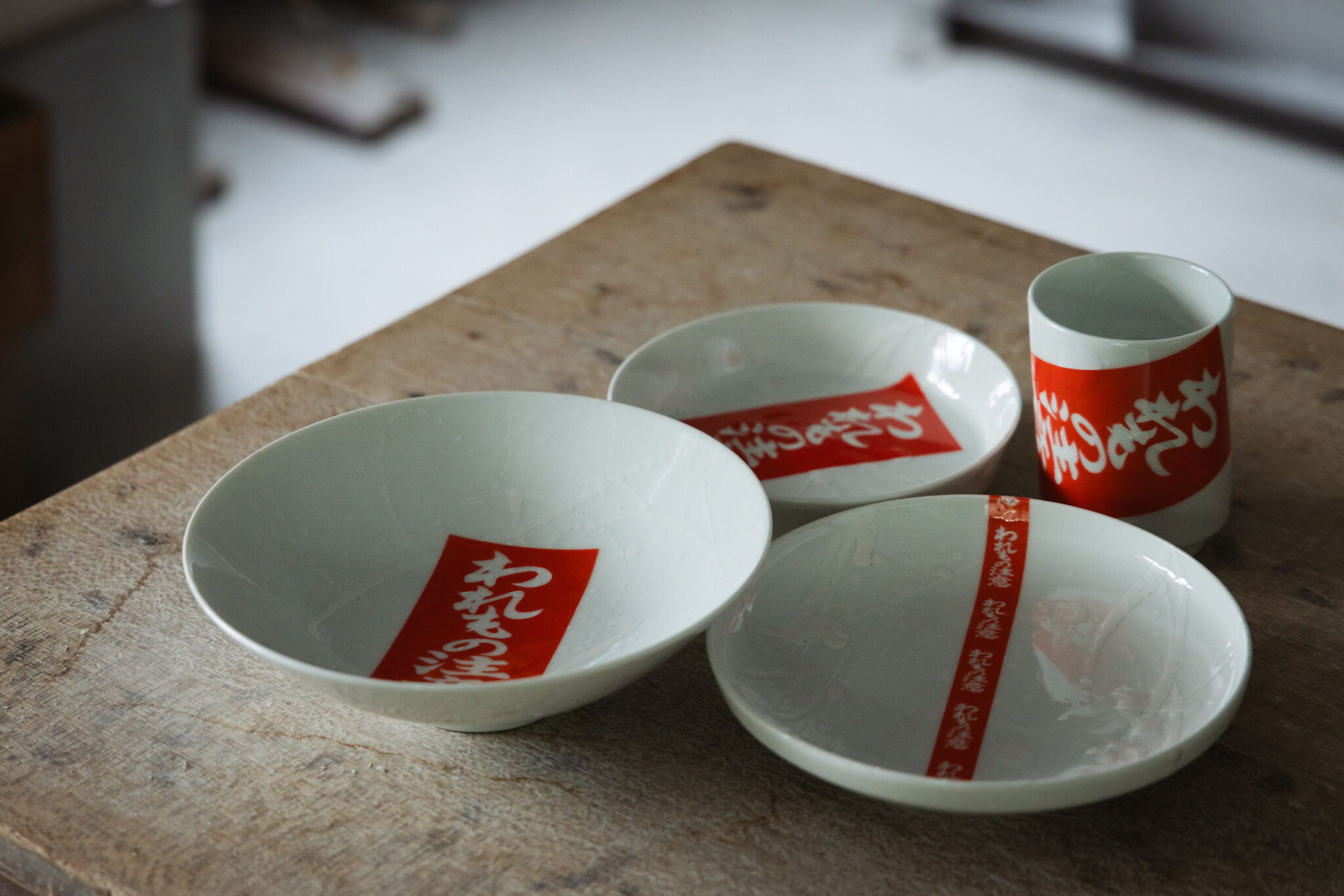 井上さん:まず、文字が好きなんですよ。特に日本語と漢字が好きです。「われもの注意」シリーズは、いつも見慣れている段ボールに貼ってある、そのシールがとても気になる存在だったんです。真っ赤だし、すごいメッセージを発しているし。そもそも、こういうチョイスって、本来割れ物である器にはないなと思っていました。そして、ふと「われもの注意」の文字を器に載せてみようかなと思ったんです。