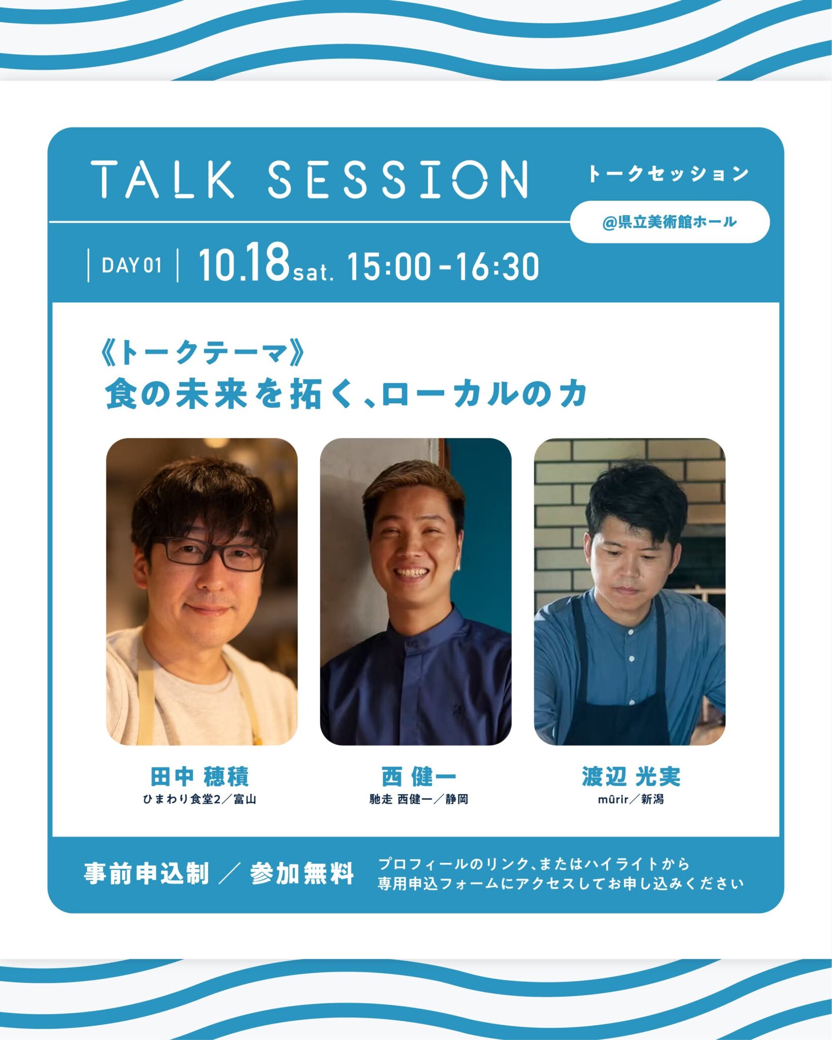 2つ目は「ローカルガストロノミー」。近年、地方の食に注目が集まる中、その土地の風土を料理で表現し、旅の目的地となる「ディスティネーション・レストラン」を営んでいる富山県・静岡県・新潟県の3名のシェフたちに、レストラン誕生の背景や想いをお話しいただきます。