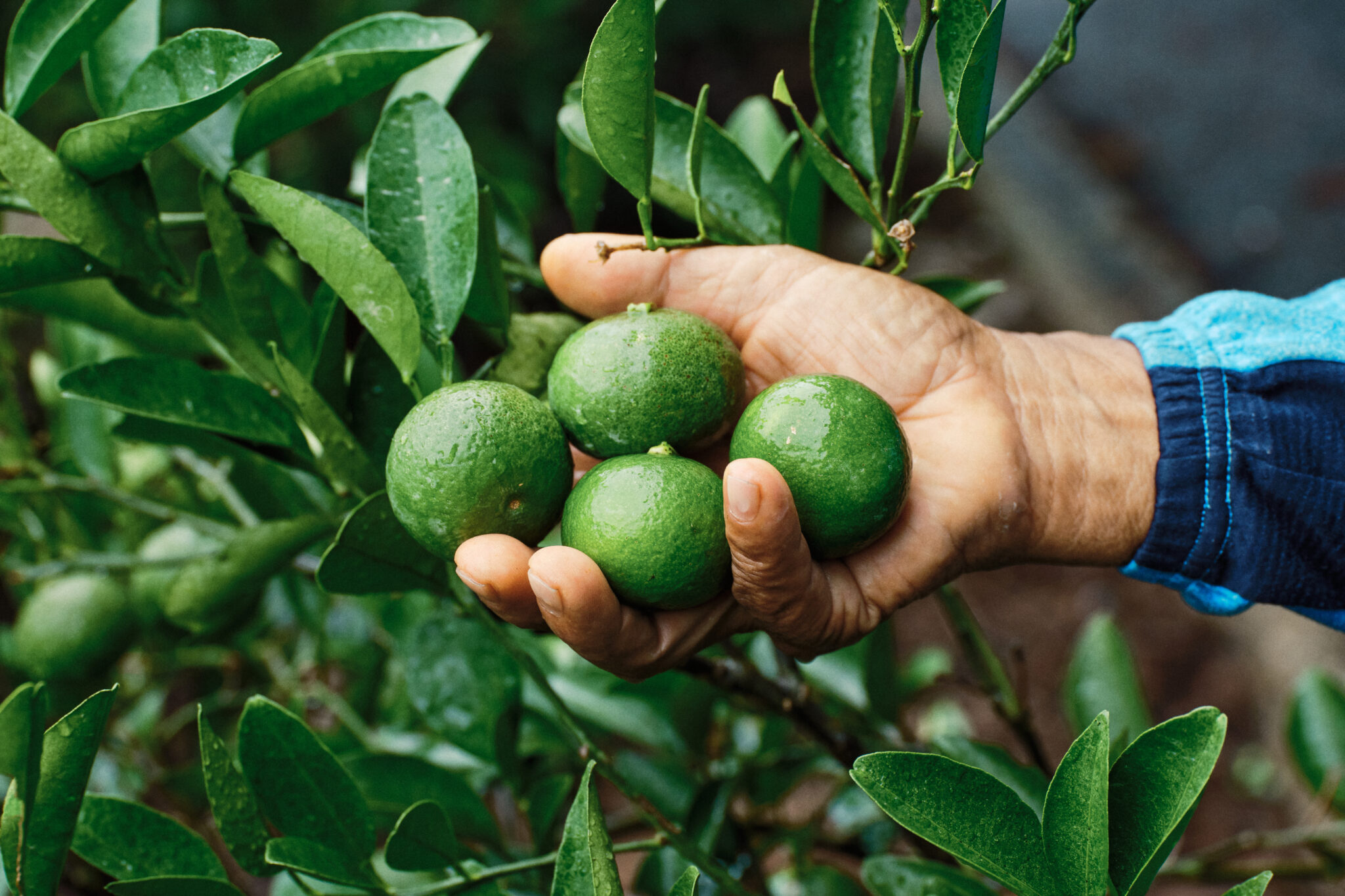 ビオレソリエスの他にも、玄界灘に浮かぶ馬渡島(まだらじま)にしか自生していなかった絶滅寸前の柑橘〈ゲンコウ〉や、インド原産で主に花材として求められる〈仏手柑(ぶっしゅかん)〉といった、希少果実だけを栽培する。