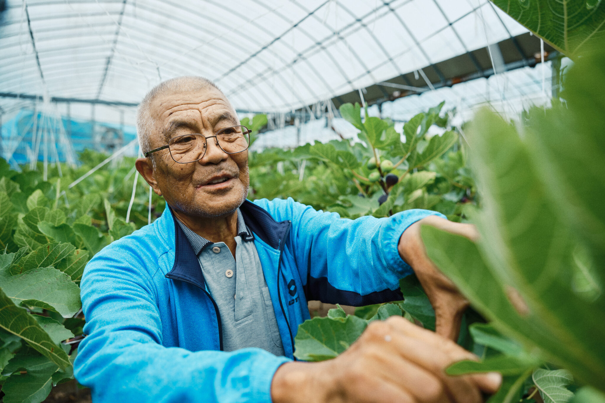 富田秀俊/とみた・ひでとし。1949年唐津市浜玉町生まれ。富田農園園主。国内で初めて黒いちじく〈ビオレソリエス〉の栽培に成功。そのほかにも国内での事例が少ない希少種の栽培で注目される生産者。「農家だから販売は専門外」と商品は通販でのみ出荷されるが、多くの料理人や菓子メーカーなど多岐にわたる顧客がその商品を待ち侘びている。孫たちとの触れ合いが楽しみな家族思いの一面も持ちつつ、常に地域の農業の未来を見つめ、作物を思い、次の一手を考える“魂の農業家”である。