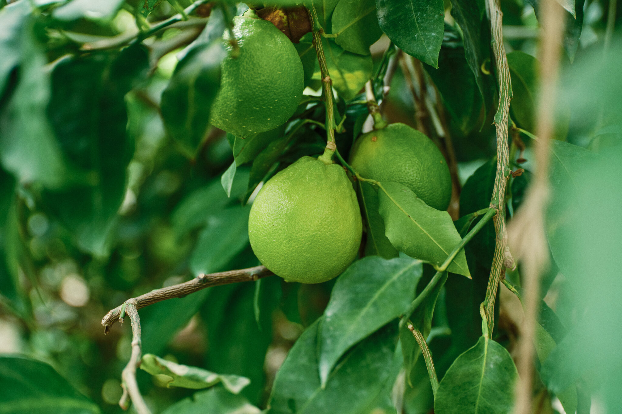 3mほどに育ったベルガモットの樹には、ずっしりとした実がいくつも実っている。栽培を始めた当初は徒長ばかりして実をつけない“暴れ馬”だったが、ブドウのような棚作りに変えることで問題を解決した。