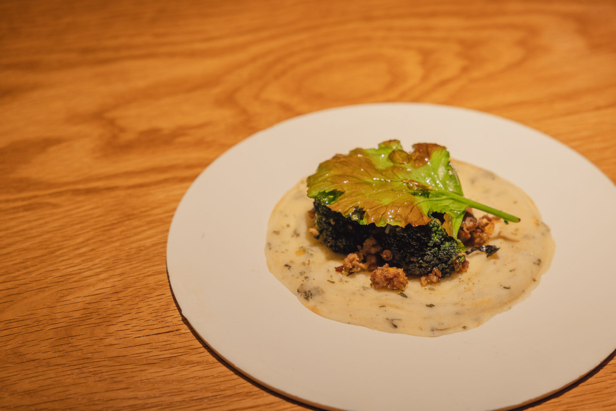 川岸さん:こちらの薄焼きのパンは、USEUM SAGAで「ポーポー」という名前でお出しした、宮廷料理の一つです。このクレープのような料理を沖縄で見た時に、これは和紙と合わせたいなと思い、イベントでは名尾和紙と共に提供しました。上にはブロッコリーなどの野菜たちを乗せています。